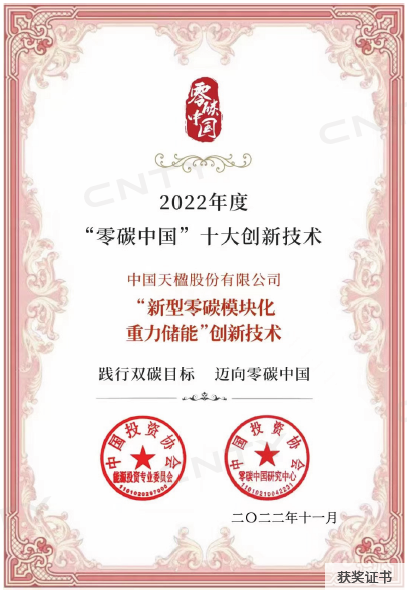 11月8日,在國家生態(tài)環(huán)境部應(yīng)對氣候變化司、國家能源局新能源和可再生能源司指導(dǎo)下,由中國投資協(xié)會主辦,落基山研究所聯(lián)合主辦,中國投資協(xié)會能源投資專委會、中國投資協(xié)會零碳中國研究中心承辦的“2022(第三屆)國際碳中和與綠色投資大會暨零碳中國城市峰會”在上海成功舉辦。會上,中國投資協(xié)會能投委秘書長張杰公布了2022年度十大“零碳中國”創(chuàng)新技術(shù),中國天楹股份有限公司申報的“新型零碳模塊化重力儲能”創(chuàng)新技術(shù)成功入選。