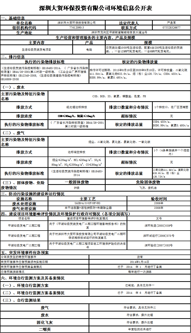 深圳市大貿(mào)環(huán)保投資有限公司2016年環(huán)境信息公開(kāi)表