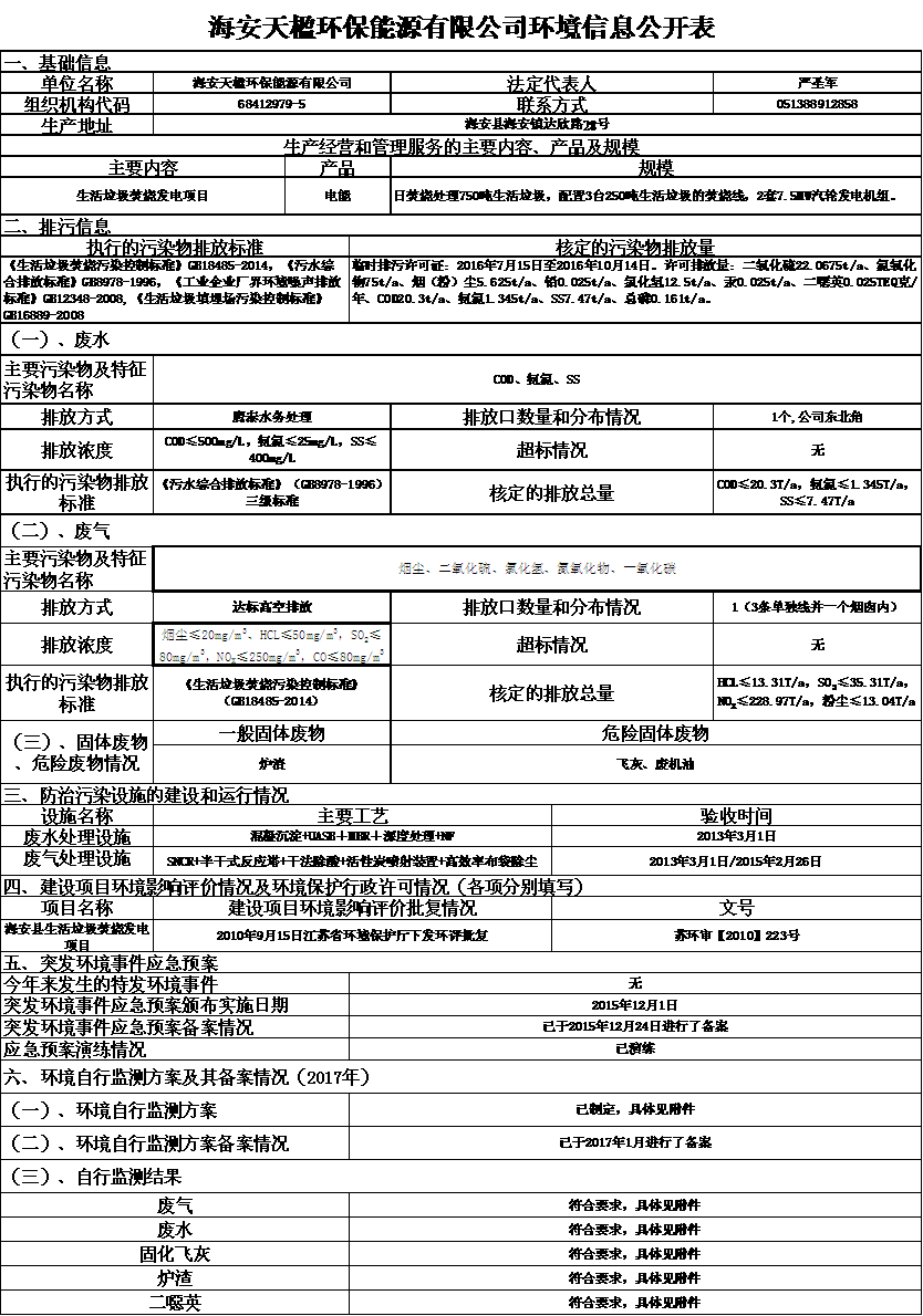 海安天楹環(huán)保能源有限公司2017年環(huán)境信息公開表