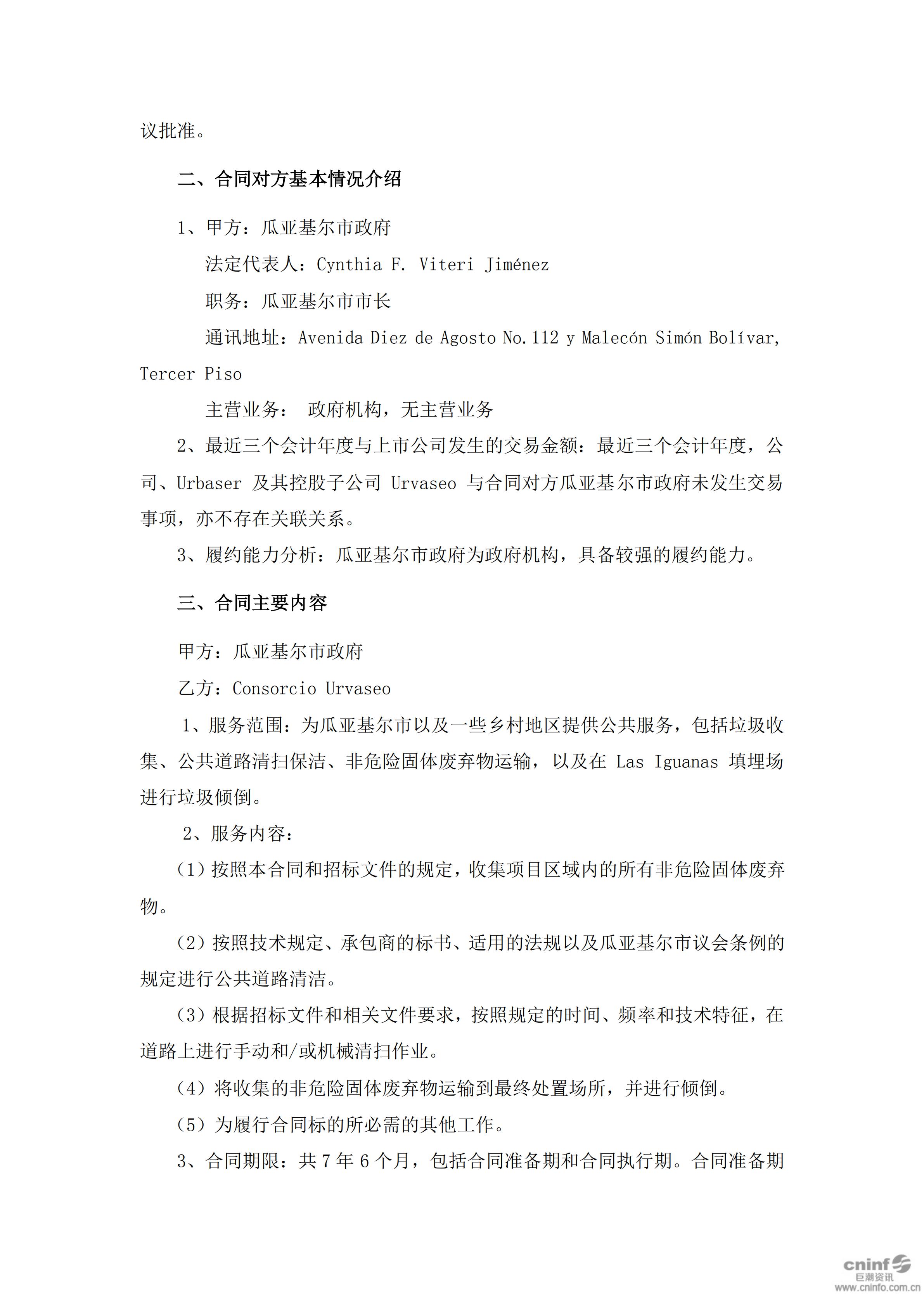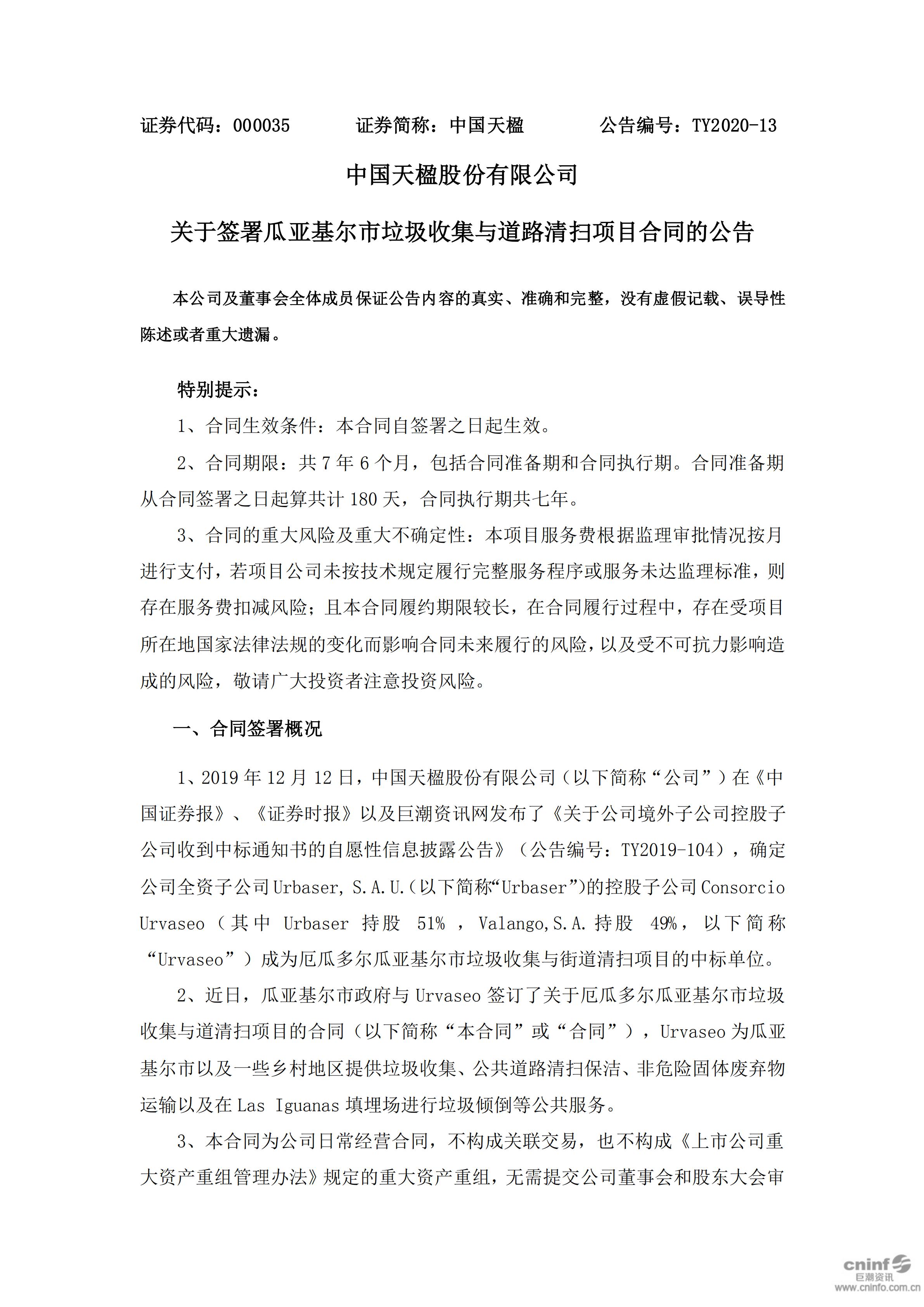 中國天楹:關(guān)于簽署瓜亞基爾市垃圾收集與道路清掃項目合同的公告